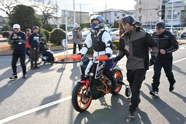 同じく視覚障害の植村さんもクラッチ付きのバイクは初めて。でも最後にはまっすぐ走れるようになっていました。「ハンドルをまっすぐにしてるつもりなんですけど、腕が突っ張っちゃってて、気が付かないうちに曲がっちゃいうことがどうもあるみたい。もっと腕の力を抜いて楽に走らないと」と早くもライダーとしての資質が感じられました。